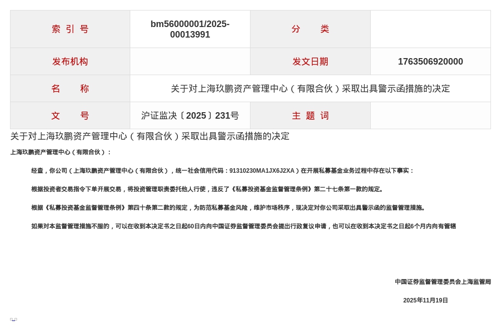 为防范私募基金风险,维护市场秩序,中国证券监督管理委员会上海监管局决定对上海玖鹏资产管理中心(有限合伙)采取出具警示函的监督管理措施。