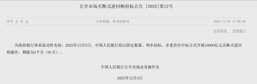 12月4日晚,央行公告显示,为保持银行体系流动性充裕,2025年12月5日,中国人民银行将以固定数量、利率招标、多重价位中标方式开展10000亿元买断式逆回购操作,期限为3个月(91天)。