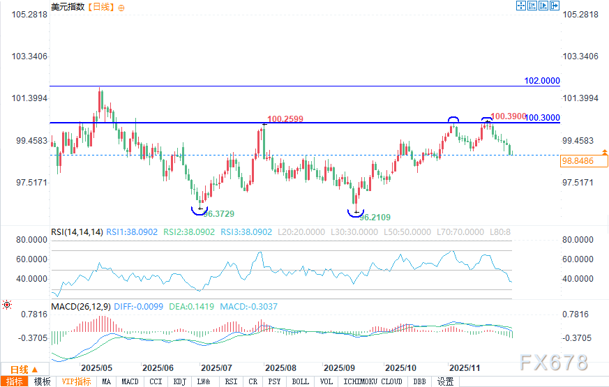 汇通财经APP讯——周四(12月4日)欧盘时段,美元指数在亚盘早盘冲高至99.3上方的动能骤然退潮,午后快速回落并在低位震荡,RSI指标同步走弱,分时图上呈现“冲高遇阻、短期承压”的态势。