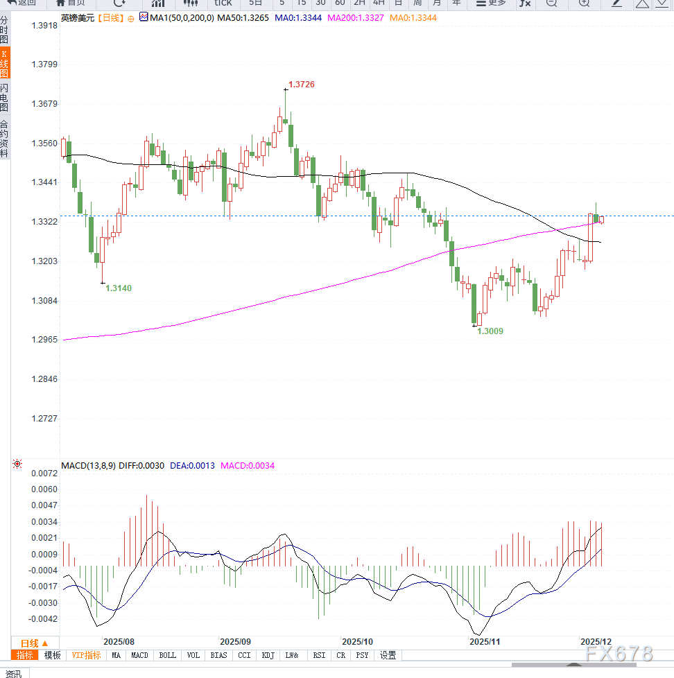 从日线图形来看,GBP/USD短线维持偏多结构:汇价现报1.3328,稳守100日指数均线(1.3300)之上,均线平缓后支撑汇价上行。汇价接近布林带上轨(1.3348),布带扩张显示波动率上升和多头压力增强。