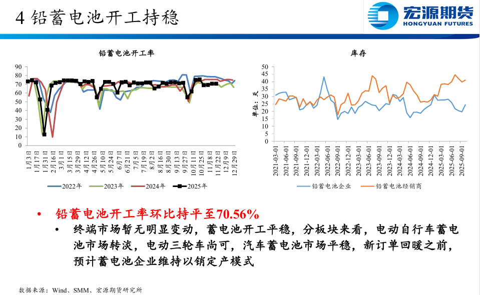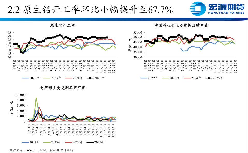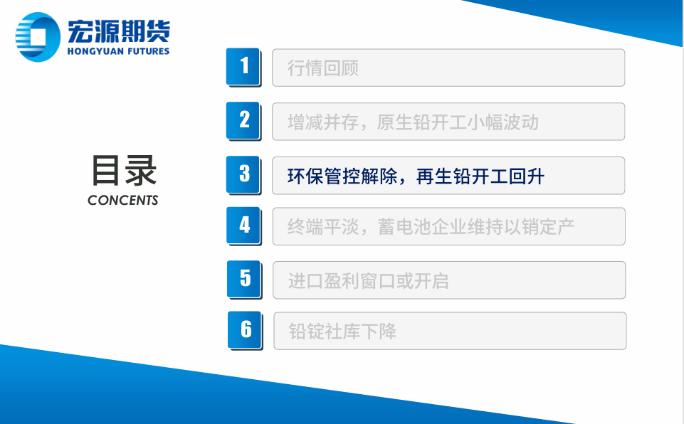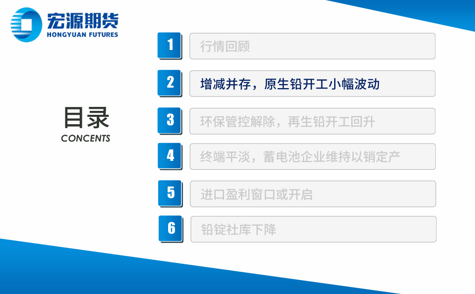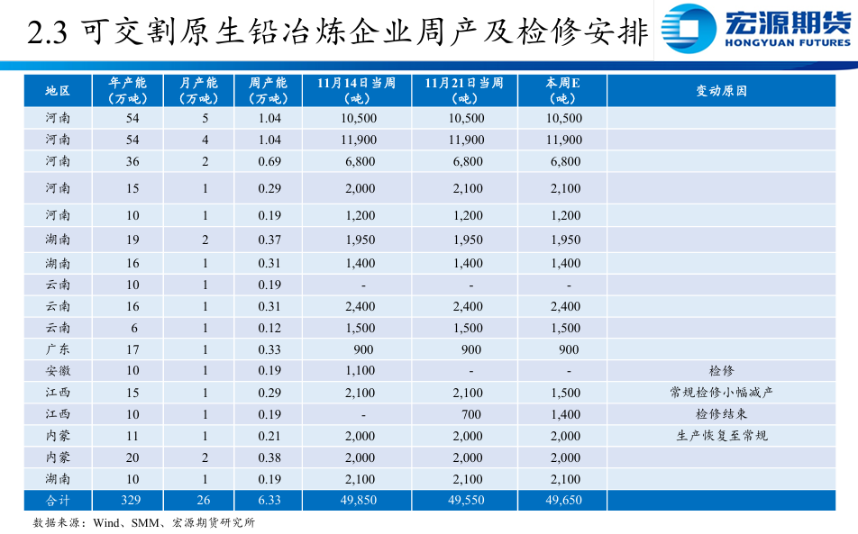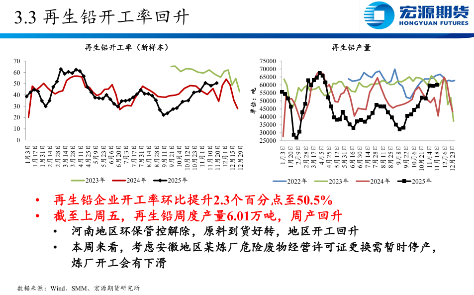 供给端::原生铅开工增减并存,产量小幅波动;再生铅方 面随着环保管控解除,开工有所回升,但本周安徽地区某 炼厂危险废物经营许可证更换需暂时停产,或带动炼厂开 工下滑,后续需持续关注炼厂高开工下原料是否能够及时 得到补充。