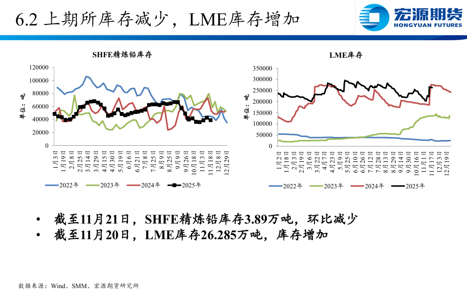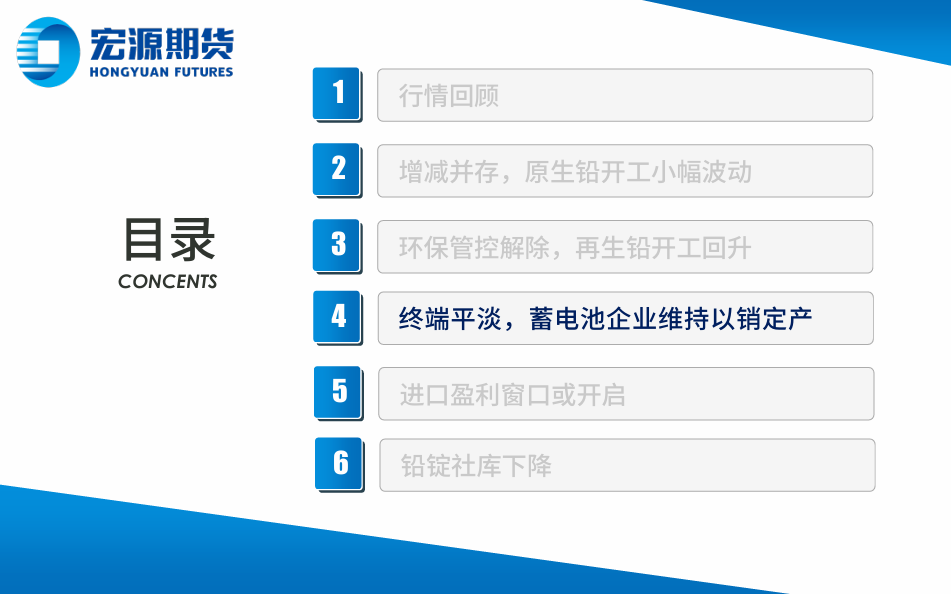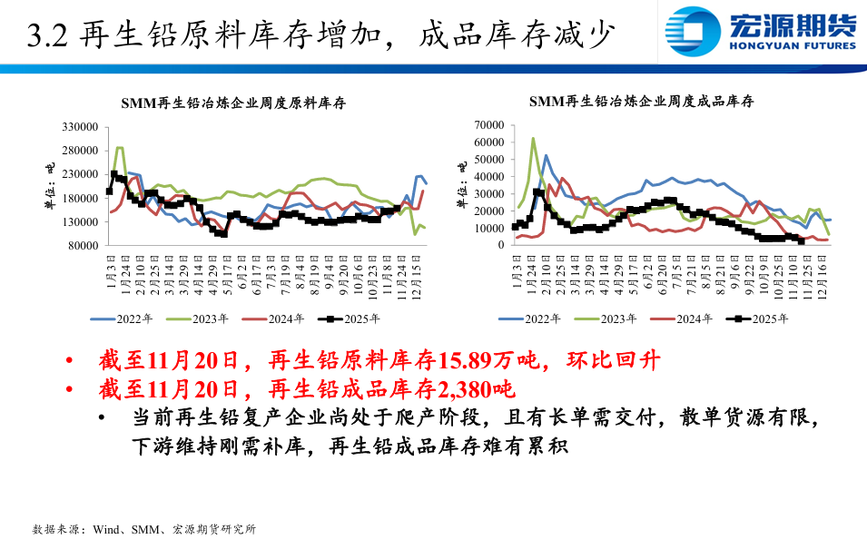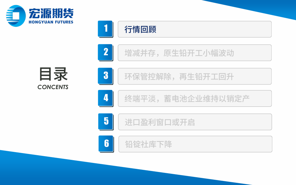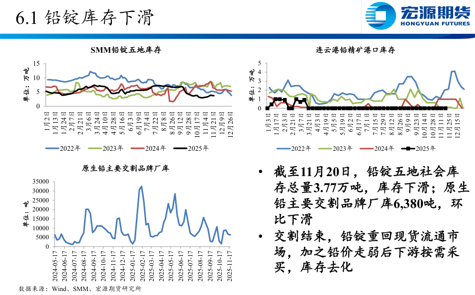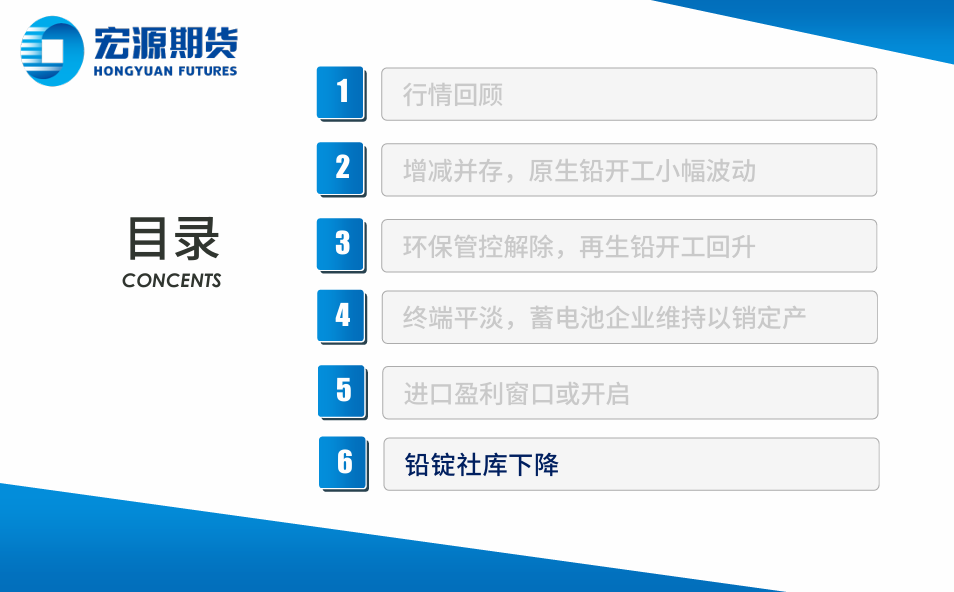 供给端::原生铅开工增减并存,产量小幅波动;再生铅方 面随着环保管控解除,开工有所回升,但本周安徽地区某 炼厂危险废物经营许可证更换需暂时停产,或带动炼厂开 工下滑,后续需持续关注炼厂高开工下原料是否能够及时 得到补充。