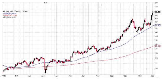这次看起来确实不同。白银于10月3日触及48美元,并在接下来的一周首次收于50美元上方。它在48美元附近短暂盘整,多次试探这一水平,然后近几周再次起飞。