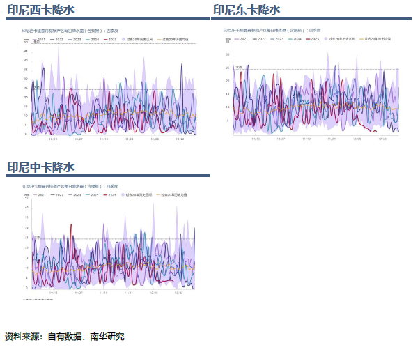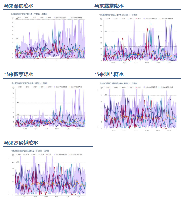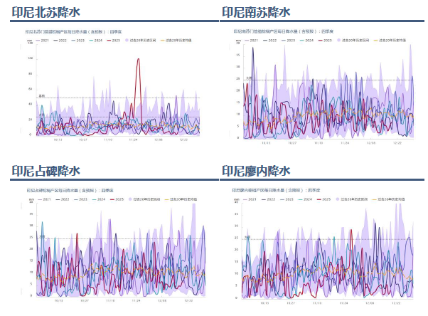 据我们对印尼北苏的降水量统计图来看,11月27日单日降水量超过100毫米,属于最高等级的大暴雨,极具破坏力,构成洪水发生的前提条件,但后续几日并没有出现暴雨情况,降水量维持在大雨范围之下,这使得破坏力没有继续扩大,而观察其它地区降水,除了廖内11月28日单日降水量超过25毫米,为大雨,其余地区降雨量并不高,且降雨量有递减趋势,因此印尼本次洪水影响较为可控,对棕榈油主产区的影响范围更小,预计对产量损伤不大。