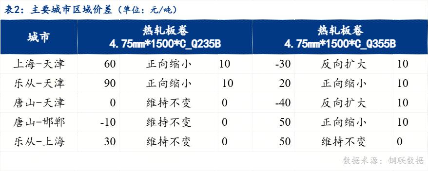 从区域价差来看,4.75mm普卷华南与华北价差90元/吨,华东与华北价差60元/吨,华南与华东价差30元/吨。京津冀地区价差来看,唐山与天津价差持平,唐山与邯郸价差-10元/吨。