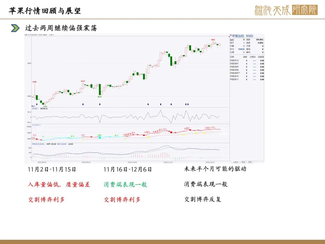 近两周苹果盘面仍维持偏强震荡,苹果入库已经结束,入库量处于近几年低位,销售前期,冷库货源总体充足,近段时间部分存储商对后期行情逐渐转变为悲观情绪,出货积极性良好。