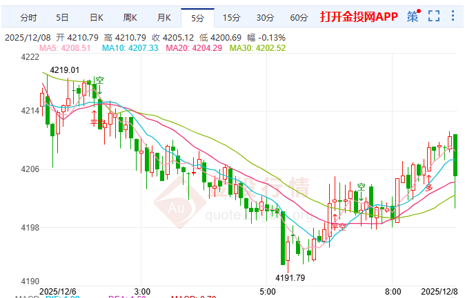 周一(12月8日)亚市早盘,现货黄金震荡小涨。 市场静待本周美联储降息,目前降息25个基点概率为86.2%,同是,地缘不确定性也支持金价。截至发稿金价最新报4204.89美元/盎司,涨幅0.15%,最高上探至4211.27美元/盎司,最低触及4195.31美元/盎司。