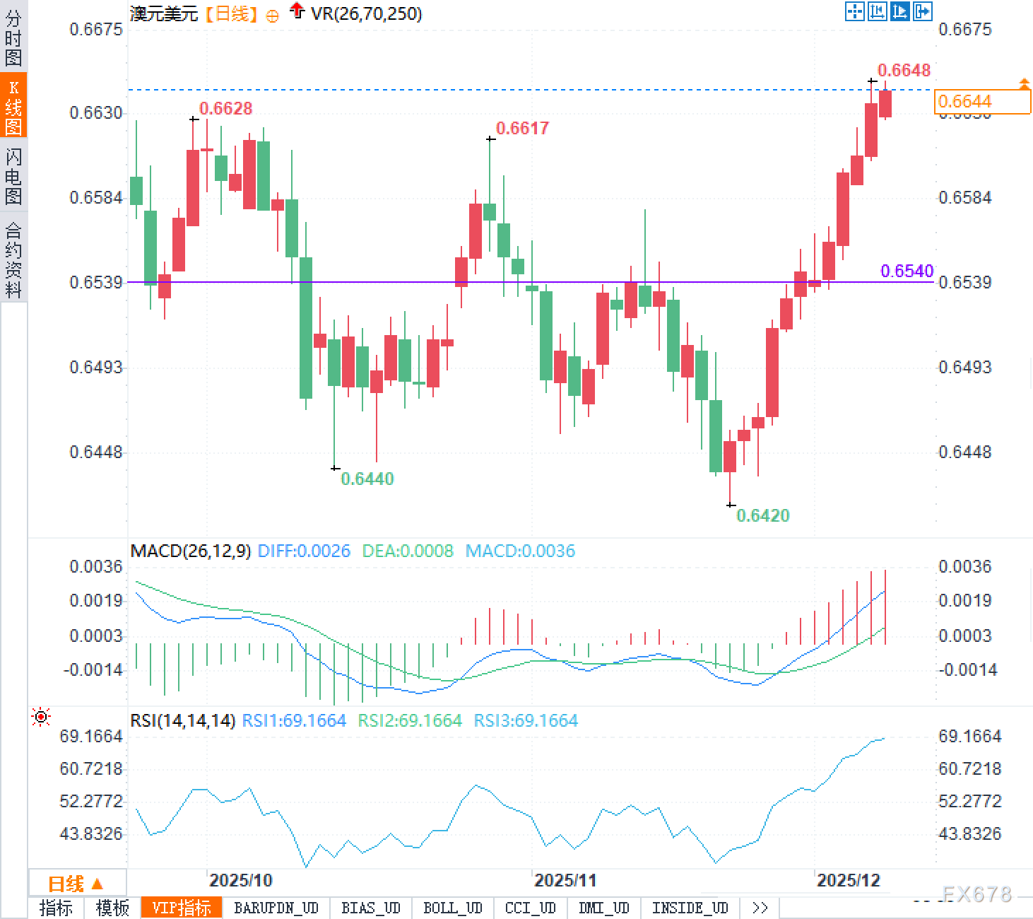 汇通财经APP讯——12月8日,星期一。美元整体维持偏弱震荡态势,美元指数在五周低点附近徘徊,反映出市场对美联储即将开启降息周期的普遍预期。与此同时,非美货币中,澳元表现尤为突出,兑美元连续第十二个交易日上涨,盘中一度逼近0.6650的关键心理关口,创下两个多月以来的新高。