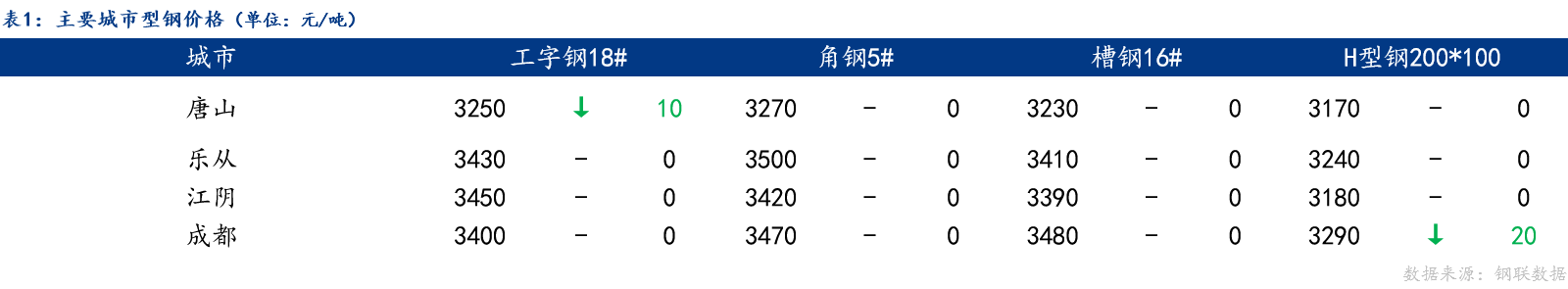 今日型钢价格持稳,唐山工字钢价格较上一交易日下跌10元/吨,角钢、槽钢、H型钢价格较上一交易日持稳;乐从、江阴工字钢、角钢、槽钢、H型钢价格较上一交易日持稳;成都工字钢、角钢、槽钢价格较上一交易日持稳,H型钢价格较上一交易日下跌20元/吨。