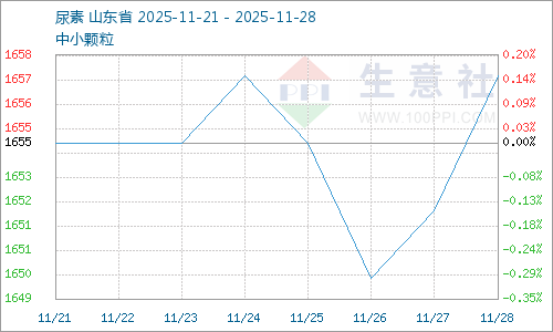 据生意社商品行情分析系统,截止11月28日,国内尿素市场参考均价为1657元/吨,较11月21日市场参考均价1655元/吨,本周国内尿素市场价格上涨幅度为0.15%。