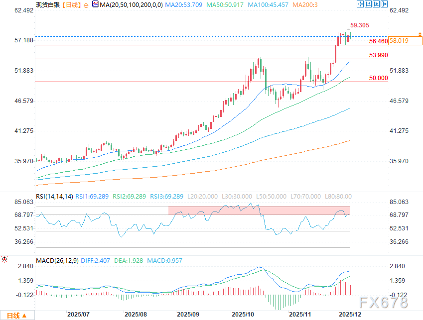 汇通财经APP讯——周一(12月8日)美盘时段,现货白银本小幅走弱,价格波动区间未突破上周五的范围,表明市场在经历一轮暴涨后进入休整阶段。交易员既未大举做空打压银价,也未急于追涨至 59.34 美元上方。这种犹豫态势值得关注,尤其是下方 56.46 美元的上周低点,以及 53.99 美元的短期多空分水岭,均为市场下一步走向的关键判断位。