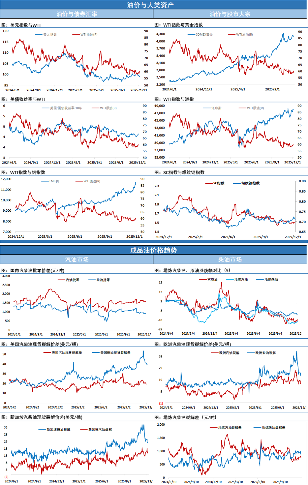 周一油价大跌2%,一天就收回了上周后半段连续三天的反弹。过去一周俄乌和平谈判对油价的影响逐渐退潮,短期内在俄乌和平推进上预计难有明显进展,这意味着市场担心的基于此的利空因素暂时消退,上周油价迎来了难得的反弹修复窗口,但这次反弹行情更多是情绪层面的修复,属于技术性反弹,空间有限。于俄乌和平谈判进展上,两名乌克兰官员表示,乌克兰总统泽连斯基面临着来自美国越来越大的压力,其被要求接受特朗普和平计划中的重大领土损失和其他让步。一名乌克兰官员表示,特朗普的顾问威特科夫和库什纳上周在与普京举行了五个小时的会谈后,从基辅的角度来看,美国的提议变得更糟了。“感觉像是美国试图用不同的方式向我们推销俄罗斯想要控制整个顿巴斯的愿望,以及美国人希望泽连斯基在电话中全盘接受,”这名乌克兰官员说。当地时间12月8日,乌克兰总统泽连斯基在英国首相府与英国首相斯塔默、法国总统马克龙、德国总理默茨进行了两个多小时的会谈。四国领导人一起讨论了旨在结束乌克兰危机的最新和平计划草案。泽连斯基表示,当天与欧洲领导人详细讨论了与美方开展的外交工作,就对乌安全保障、战后重建以及下一步行动达成共识,此外还专门就今后对乌克兰的防务支持进行了磋商。