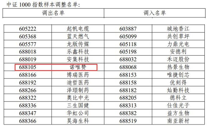 调整结果显示,诺唯赞(688105.SH)被调出中证1000指数样本。