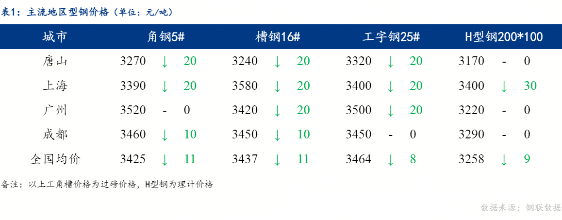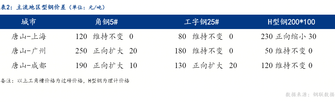 从区域价差来看,今日唐山与上海角钢、工字钢价差维持不变,H型钢价差正向缩小,唐山与广州角钢价差正向扩大,工字钢、H型钢价差维持不变,唐山与成都角钢、工字钢价差正向扩大,H型钢价差维持不变。