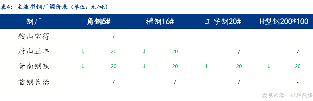 2、成交量为20家型钢厂当日成交,其中包括工字钢6家、角钢7家、槽钢7家。