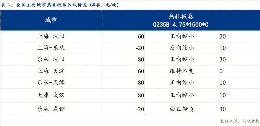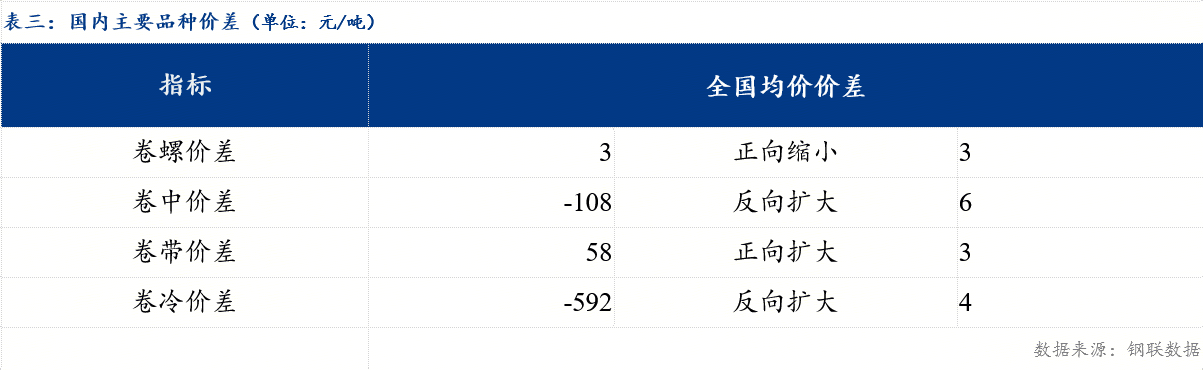 从品种价差来看,卷螺差较上一交易日正向缩小3元/吨,热中价差较上一交易日反向扩大6元/吨,热带价差较上一交易日正向扩大3元/吨,热冷价差较上一交易日反向扩大4元/吨。