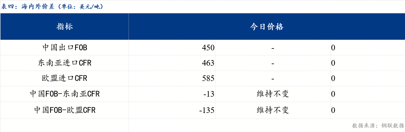 从区域价差来看,华东与东北价差60元/吨,较上一交易日正向缩小20元/吨;华东与华南价差-20元/吨,较上一交易日反向缩小10元/吨;华南与华北价差80元/吨,较上一交易日正向缩小10元/吨。