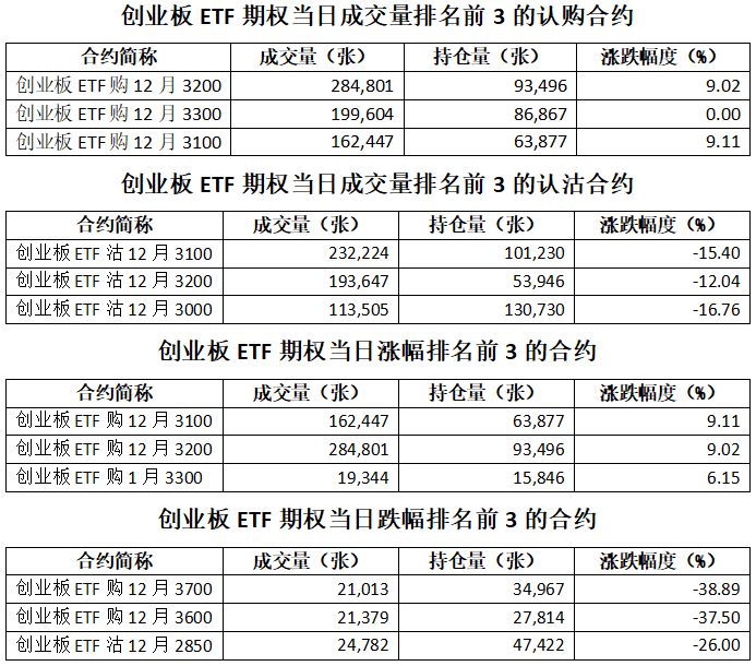 创业板ETF期权总成交面额636.56亿元,减少15.72%,期现成交比为0.32,权利金成交额12.18亿元;期权总成交量2,065,031张,减少16.32%,其中认购期权成交量1,058,067张,认沽期权成交量1,006,964张,认沽认购成交比率为0.95(上一交易日认沽认购成交比率为0.85)。