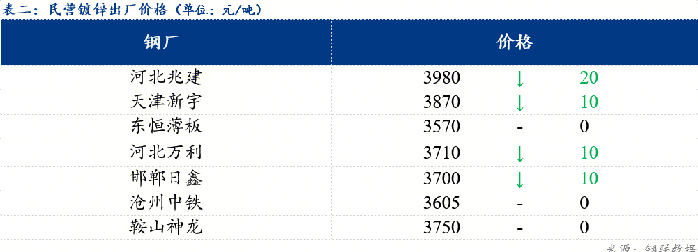 今日北方民营钢厂镀锌出厂指导价在3605-3980元/吨。