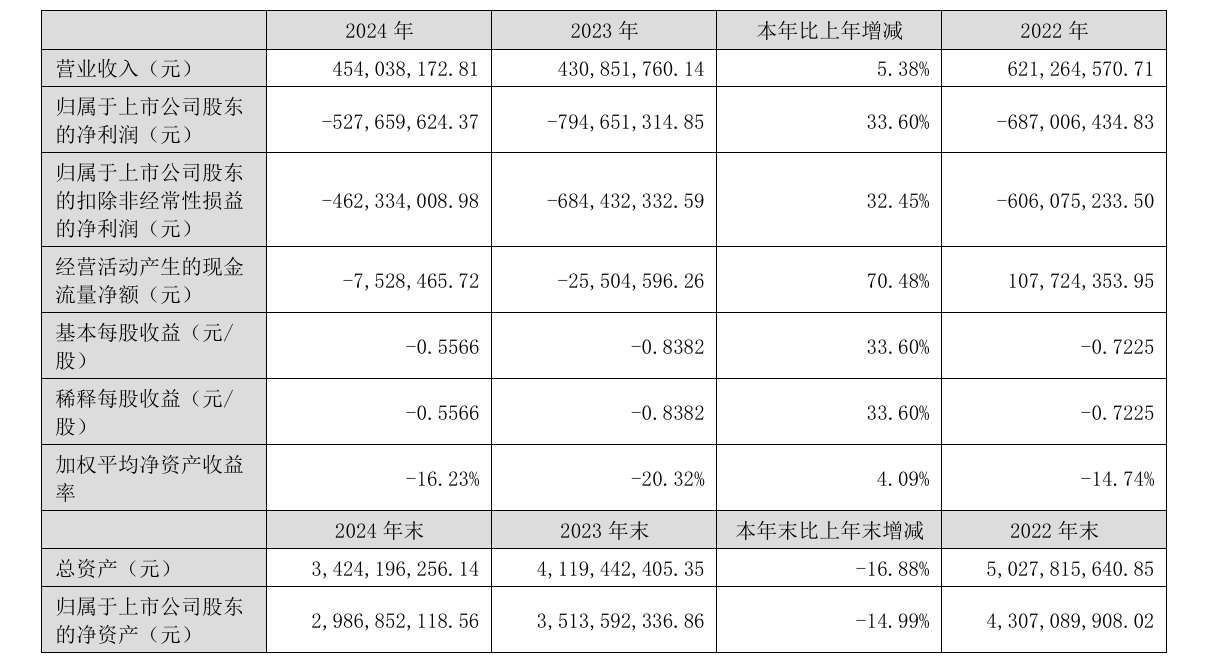 2022年至2024年,公司营业收入分别为6.21亿元、4.31亿元、4.54亿元;同时,归母净利润连续三年亏损,分别为-6.87亿元、-7.95亿元、-5.28亿元,三年累计亏损超20亿元。