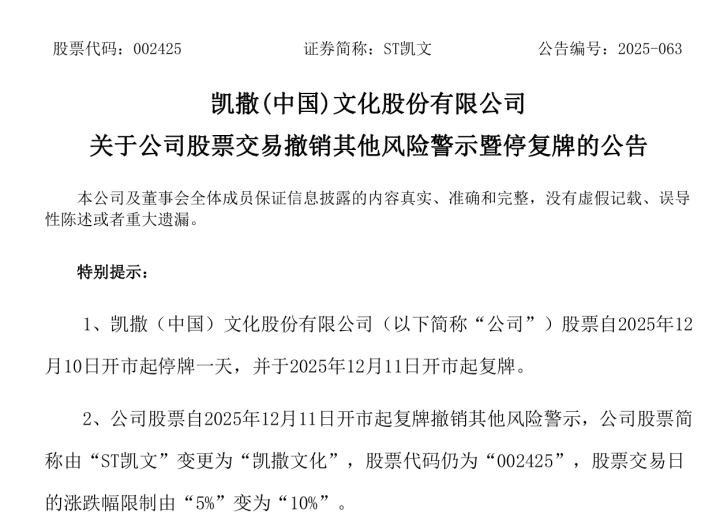 【大河财立方记者王宇】12月9日晚间,ST凯文公告,公司股票将于12月10日停牌一天,12月11日起复牌并撤销其他风险警示。复牌后,股票简称将变更为“凯撒文化”,日涨跌幅限制由5%恢复至10%。