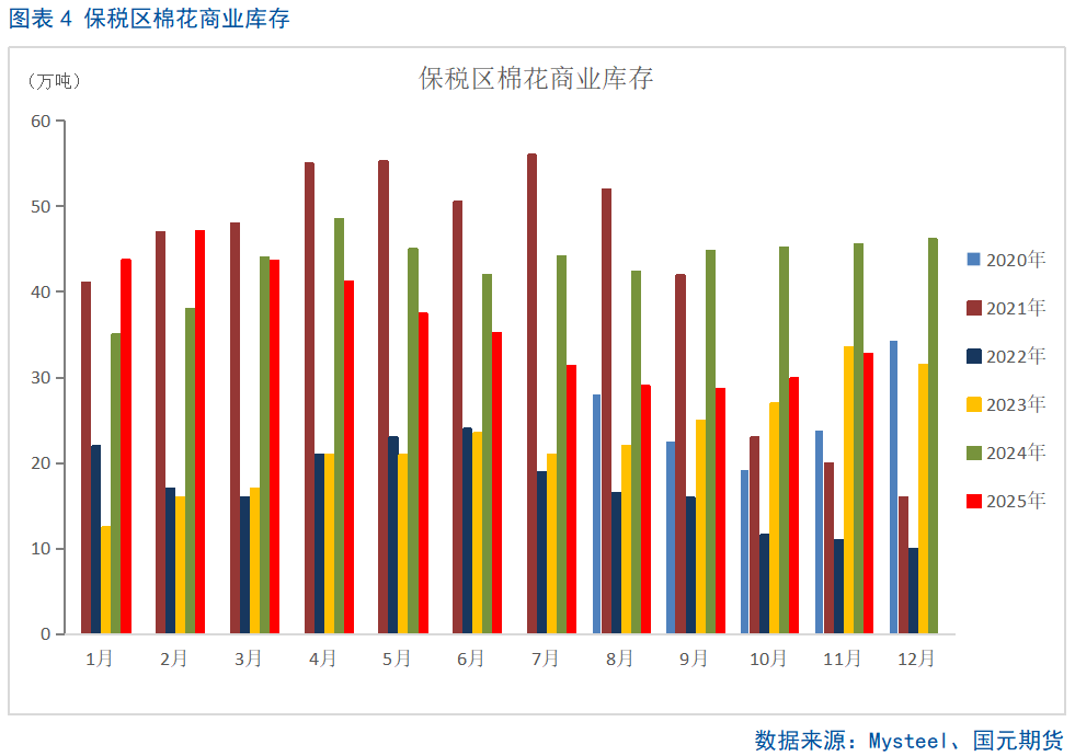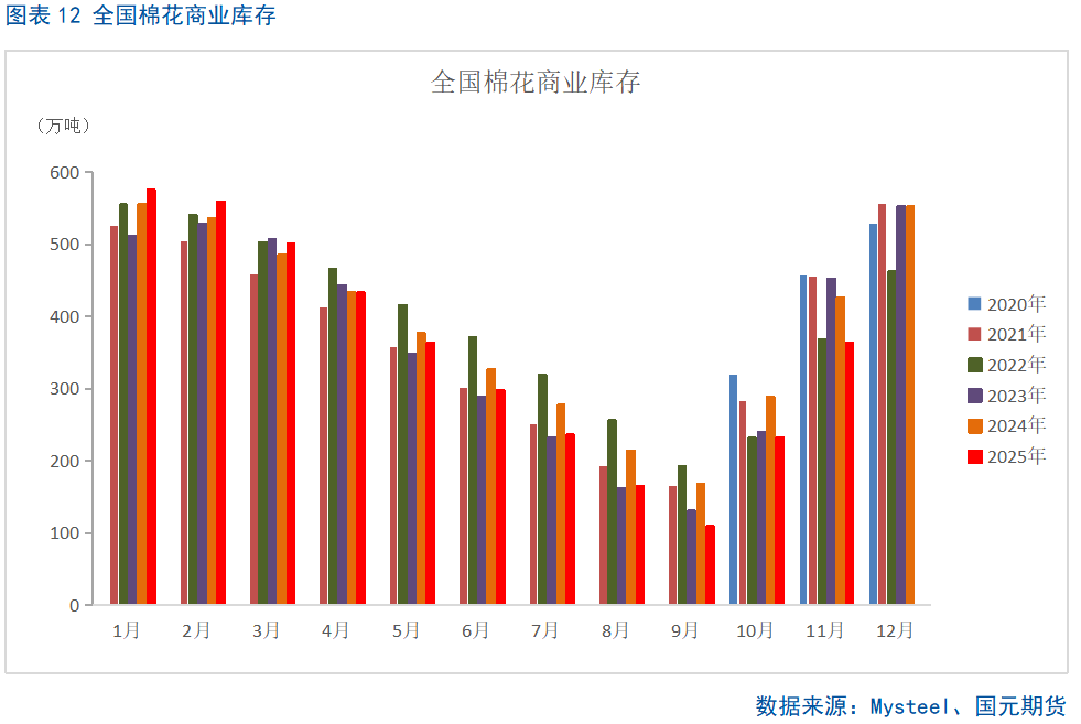 随着疆内采摘陆续结束,轧花厂皮棉加工量将近过半,新疆库点增长明显,明显高于去年同期水平。下游纺企由于旺季结束后订单量减少,刚需补货背景下皮棉出库量一般,全国商业库存继续呈现增加之势。据Mysteel调研显示,截至2025年11月28日,棉花商业总库存417.94万吨,环比上周增加37.93万吨,增幅为9.98%。其中,新疆地区商品棉361.64万吨,周环比增加37.39万吨,增幅为11.53%。内地地区商品棉18.27万吨,周环比增加0.06万吨,增幅为0.33%。