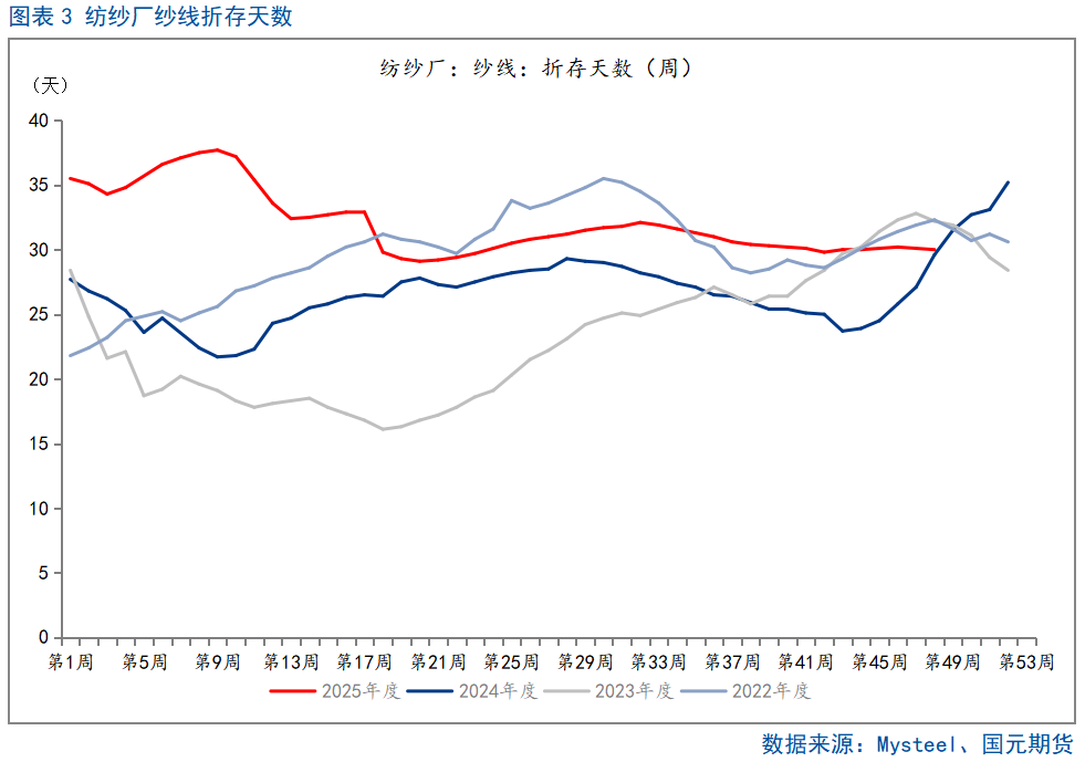 近日贸易商采购增加,40s以上高支纱走货加快,纺企整体库存下降明显,新疆大型厂成品纱库存约35天左右,内地企业库存维持在11-15天。据Mysteel农产品数据监测,截至11月27日,主要地区纺企纱线库存为30天,周度下降0.66%,刷新4周低点。