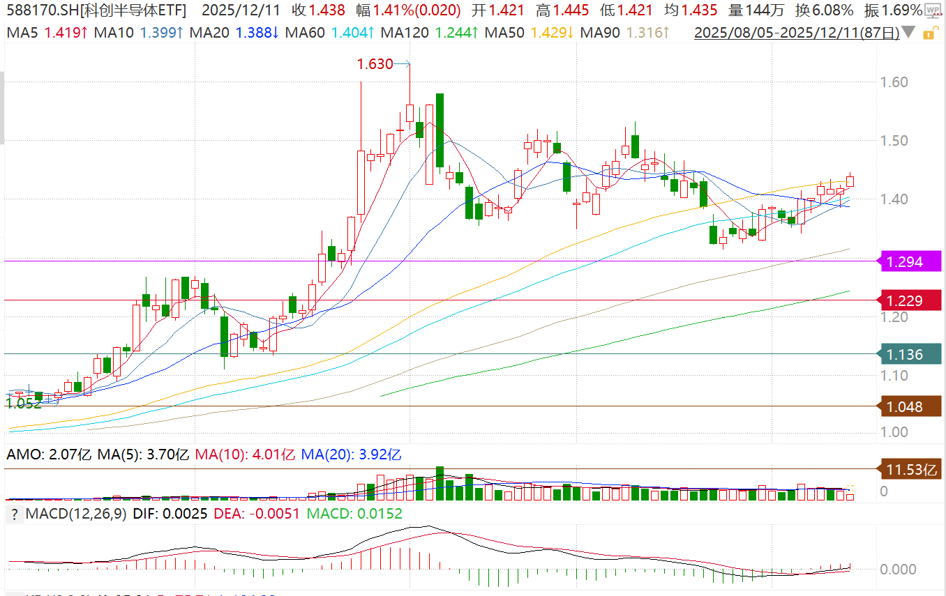 科创半导体ETF(588170)今日强势上涨,有望实现6连阳,MACD已然形成金叉,红柱扩大,意味着资金力量正在积蓄。