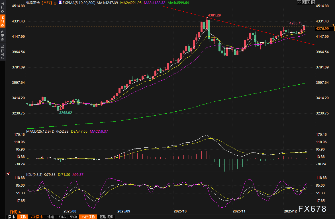 汇通财经APP讯——在全球经济不确定性笼罩下,黄金作为传统避险资产再次闪耀光芒。周四(12月11日),随着美联储连续第三次降息25个基点,黄金价格强势反弹,现货黄金上涨1.2%,触及每盎司4285.75美元的逾一个月高点,而白银更是创下每盎司64.31美元的历史新高。这一轮贵金属行情的爆发,不仅源于美元走软和通胀压力持续,还受到了即将公布的非农就业报告以及全球地缘政治动荡的推动。投资者们正密切关注这些因素如何交织影响黄金的未来走势。本文将深入剖析此次黄金上涨的驱动机制,探讨其背后的经济逻辑,并展望潜在的投资机遇与风险。通过这些分析,我们可以看到,黄金市场正处于一个关键位置,若能顶破4300关口,或许预示着新一轮牛市的开启。周五(12月12日)亚市早盘,现货黄金窄幅震荡,目前交投于4276.29美元/盎司。