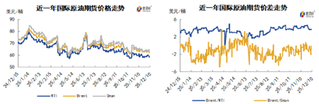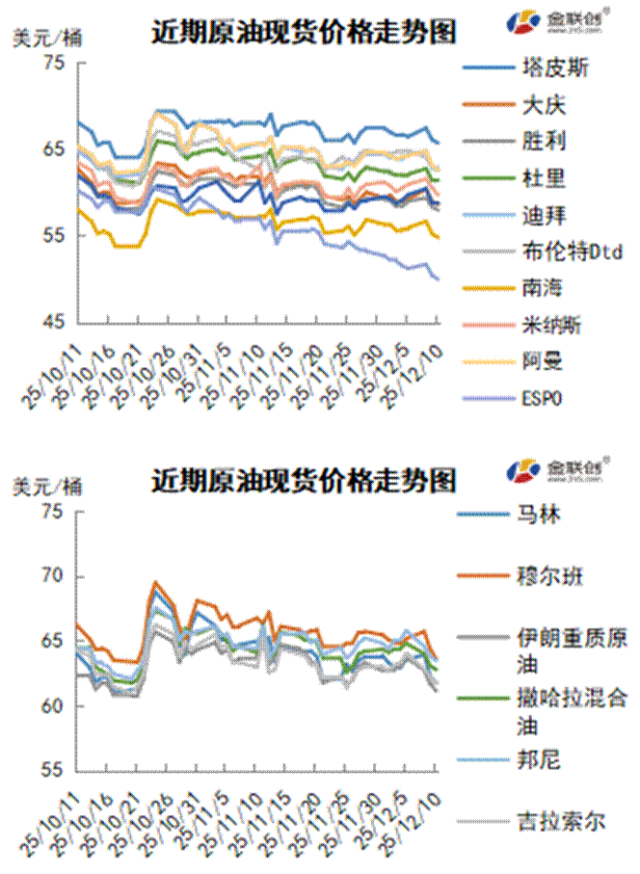 本周(12.4-12.10),原油整体呈现先扬后抑的走势,周度均价环比涨跌不一。周内前期,俄罗斯原油供应的不确定性对油价起到支撑作用。美俄高层会谈未达成解决乌克兰问题的折中方案,市场预计美国和欧洲针对俄罗斯原油出口的制裁措施短期内无法取消。乌克兰方面也加强了对俄罗斯能源基础设施的袭击,乌方声称袭击了俄罗斯克拉斯诺达尔边疆区的海港和萨马拉州的炼油厂,捷姆留克海港主要停泊普通船舶、运输液体的船舶以及散货船,港口设施本身遭到袭击后发生火灾,位于俄罗斯萨马拉州的瑟兹兰炼油厂也遭到袭击。此外,消息人士透露,由于严重风暴和近期的无人机袭击扰乱了装载作业,俄罗斯黑海港口Novorossiysk港和里海管道联盟终端11月的石油出口量较原计划减少约100万吨,Novorossiysk港11