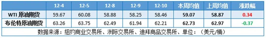 导言:本周(12.4-12.10),国际原油价格整体呈现先扬后抑的走势,周度均价环比小涨。WTI均价59.07美元/桶,较前一周上涨0.20美元/桶,或0.34%。周内,对油价起到支撑的因素有:俄罗斯原油供应的不确定性以及美国原油库存增加对油价起到支撑作用。导致油价承压的因素有:伊拉克快速恢复油田生产以及美国原油产量增加。