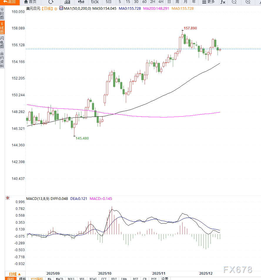 从日线结构观察,156.00至156.20区域构成短期上行的主要阻力带。若汇价突破并站稳此区间,多头或将展开新一轮空头回补,目标指向157.00一线,随后是157.50的阶段性压制。若势能延续,甚至有机会测试11月触及的158.00高点。