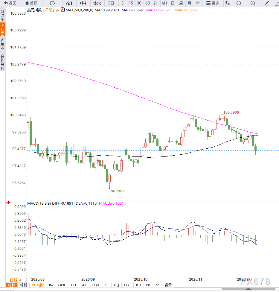 下行方面:若失守98.00整数关口,趋势将进一步目标97.40与96.85区域,市场可能进入更深的弱势通道。整体来看,美元指数仍处于下行压力中,技术面偏向持续弱势震荡。