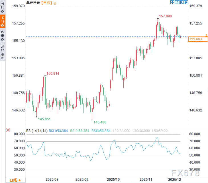 从技术分析角度看,上行方面,隔夜震荡高点(156.16)可能构成美元兑日元的近期阻力位。若能实现有效突破,或将触发新一轮空头回补行情,推动汇价测试周度高点157.00附近。后续买盘跟进将为汇价上探157.45的中期阻力位创造条件,并可能进一步挑战11月触及的157.89高位。