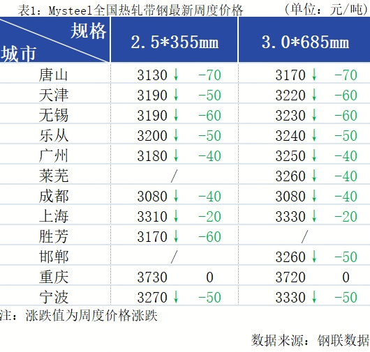 本周全国热轧带钢价格震荡下行,成交清淡。各区域供需矛盾出现不同程度的分化,具体如下:
