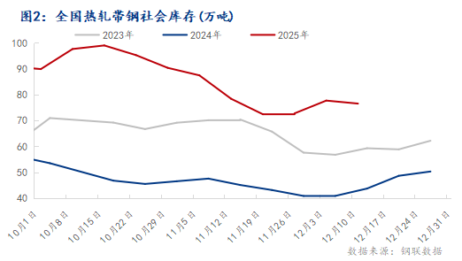 邯郸:本周邯郸地区热轧带钢市场价格震荡下行,各主流规格同步走低;供应端受冬季环保限产及钢厂检修影响,铁水和带钢供应量维持低位,需求端则因北方寒潮进入消费淡季,下游仅小批量刚性采购、高价资源成交受阻,整体成交偏弱;本周市场库存显著下降,与上周小幅累积态势相反,主要源于供应收紧及贸易商积极出货;贸易商心态谨慎、冬储意愿不强,操作上以快进快出为主。综合来看,预计下周价格窄幅震荡趋弱运行。