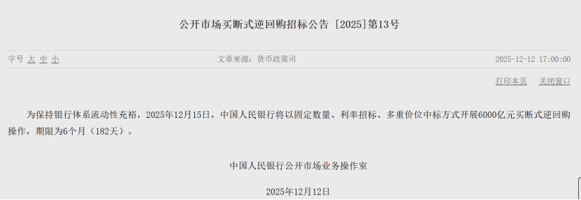 12月12日,中国人民银行(下称“央行”)发布公告称,将在15日以固定数量、利率招标、多重价位中标方式开展6000亿元买断式逆回购操作,期限为6个月(182天)。本次操作后,央行在12月两个期限品种买断式逆回购实现加量续作,为连续7个月加量续作。