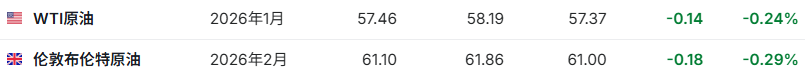 3. 截至发稿,WTI原油跌0.24%,报57.46美元/桶。布伦特原油跌0.29%,报61.10美元/桶。