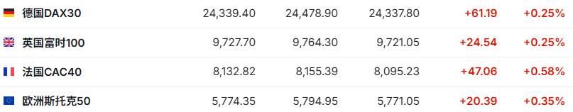 2. 截至发稿,德国DAX指数涨0.25%,英国富时100指数涨0.25%,法国CAC40指数涨0.58%,欧洲斯托克50指数涨0.35%。