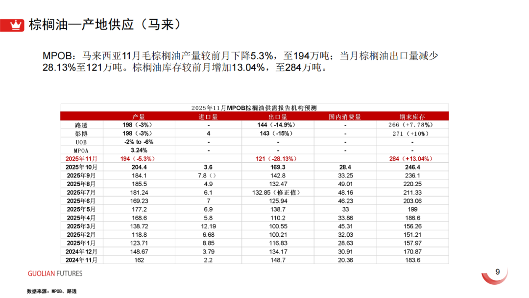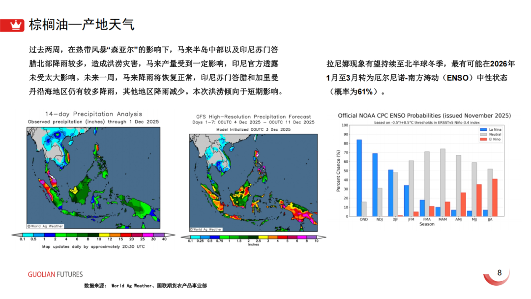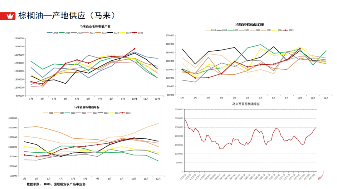 今年上半年,内外棕榈油价格呈现区间振荡走势。3月,马来西亚棕榈油进入增产周期后,出口同时出现弱势,期价应声下跌。5月,随着气象机构对厄尔尼诺现象的预期愈演愈烈,市场出现了一波反弹走势。但随着国际原油价格的下跌以及国内棕榈油及豆油库存止跌反弹,国际棕榈油价格开始走弱。 下半年,马来西亚棕榈油库存有望达...