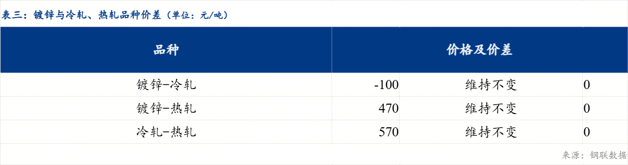 区域价差来看,天津-沈阳冷轧板卷区域价差维持不变,沈阳-哈尔滨冷轧板卷区域价差维持不变;天津-沈阳镀锌板卷区域价差维持不变,沈阳-哈尔滨镀锌板卷区域价差维持不变。品种价差来看,镀冷品种价差维持不变;镀热品种价差维持不变;冷热品种价差维持不变。