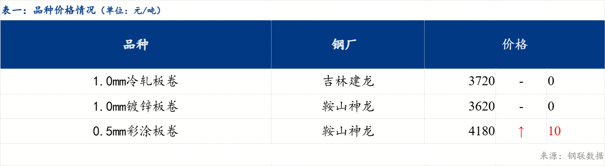 现东北主流市场冷轧镀锌价格持稳运行,沈阳市场冷轧板卷价格3720元/吨,镀锌板卷价格3630元/吨,彩涂板卷价格4180元/吨。具体来看,市场方面,今日热卷期货震荡运行,现货市场报价调整不大,市场需求依旧疲软,市场成交表现较差,镀锌大户日成交不足百吨,彩涂仅十几吨。临近年末,终端需求呈现持续收缩态势,下游制造业及建筑行业受季节性因素影响,市场采购节奏放缓,市场库存小幅增加,市场贸易商仍持谨慎观望态度为主。综合来看,预计下一交易日东北市场冷轧及镀锌板卷价格或震荡为主。