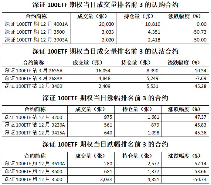 深证100ETF期权总成交面额22.29亿元,减少36.74%,期现成交比为0.01,权利金成交额0.08亿元;期权总成交量65,741张,减少41.10%,其中认购期权成交量31,645张,认沽期权成交量34,096张,认沽认购成交比率为1.08(上一交易日认沽认购成交比率为1.72)。
