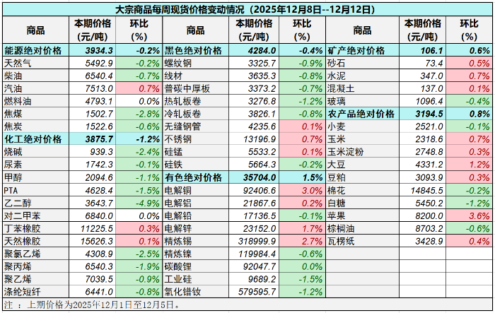 本表所示大宗商品价格(类别与产品规格说明见附表)为以人民币计价的现货价格(包含流通费用、利润和税费等)。计算这些价格时使用的信息来源,主要包括国内重点地区的生产商、贸易商及下游消费企业之间的成交、询报盘及可成交价格。价格单位为人民币元/吨。