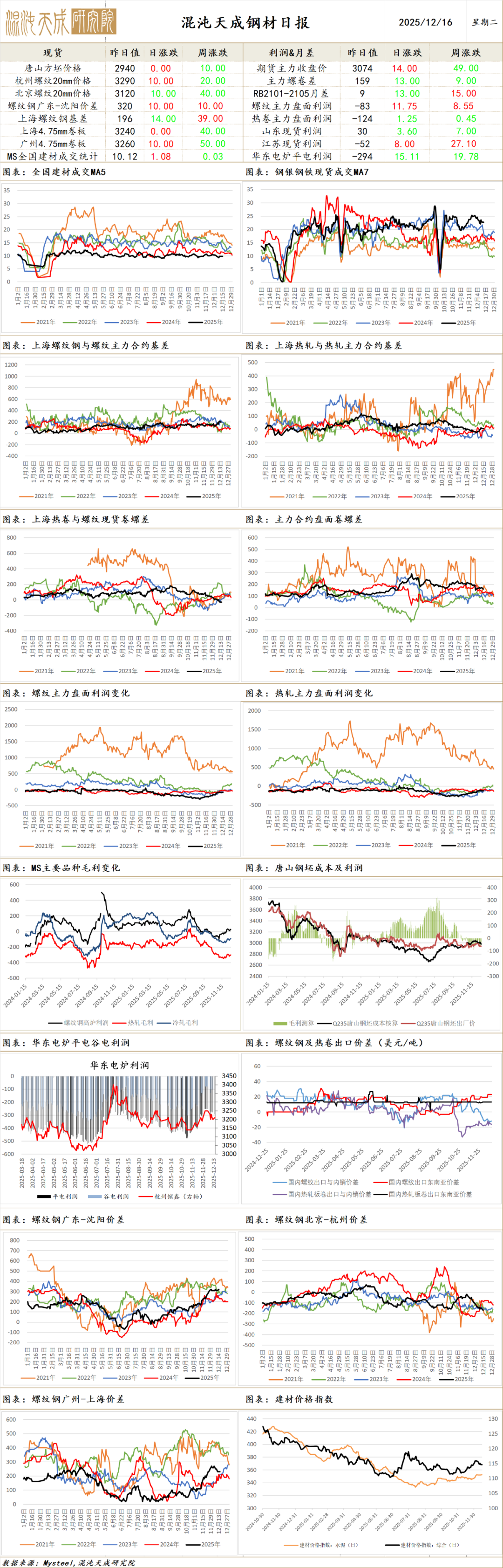 需求端,周一钢银城市钢材库存继续下降,除冷镀库存微增,其它钢材库存均有不同减量。上周钢联数据显示钢材厂库小增,社库延续下降,总库存降幅略有收窄;找钢数据显示钢材厂库、社库均延续下降,总库存降幅扩大。不过,上周机构数据均显示钢材表需有所回落,主要是建材表需降幅较大,板材表需有部分回升。另据百年建筑调研,上周全国水泥出库量298.3万吨,环比上升0.4%,基建水泥直供量环比下降1.2%;混凝土发运量为157.26万方,环比减少3.69%;样本建筑工地资金到位率59.74%,周环比上升0.25个百分点,显示建筑下游需求依然喜忧参半。海外方面,随着12月美联储降息落地叠加偏鸽言论,海外市场宽松预期增强,近期外盘商品多表现偏强。国内方面,上周两大重磅会议落幕后,近期国内各部委陆续发布反内卷、扩内需、控出口以及加强能耗管控等各方面的政策消息,整体国内宏观政策预期依然稳中向好。进出口方面,昨日美国钢价有所上涨,印度钢价涨跌互现,国外其它地区钢价依然持稳,目前国内外冷热卷价差部分走扩,国内钢材仍有一定出口空间。