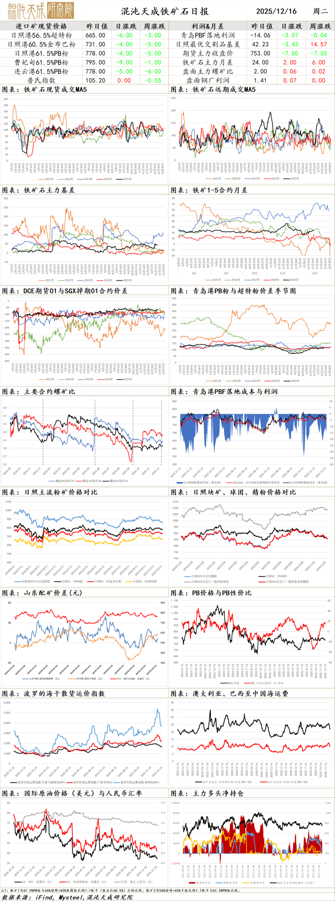 需求端,上周钢联高炉开工率继续减少,日均铁水降幅再度扩大3.1万吨至229.2万吨,同期钢厂盈利率也略有下降至35.93%。此外,上周钢厂铁矿库存有所减少,尽管进口矿日耗也有减量,钢厂进口矿库销比仍有小幅走弱。随着年末钢厂检修持续增多,对铁矿仍将维持按需采购。昨日铁矿港口现货成交略有下降,远期美元货成交有小幅回升,目前PB粉落地亏损小幅走扩,显示国外需求仍强于国内。