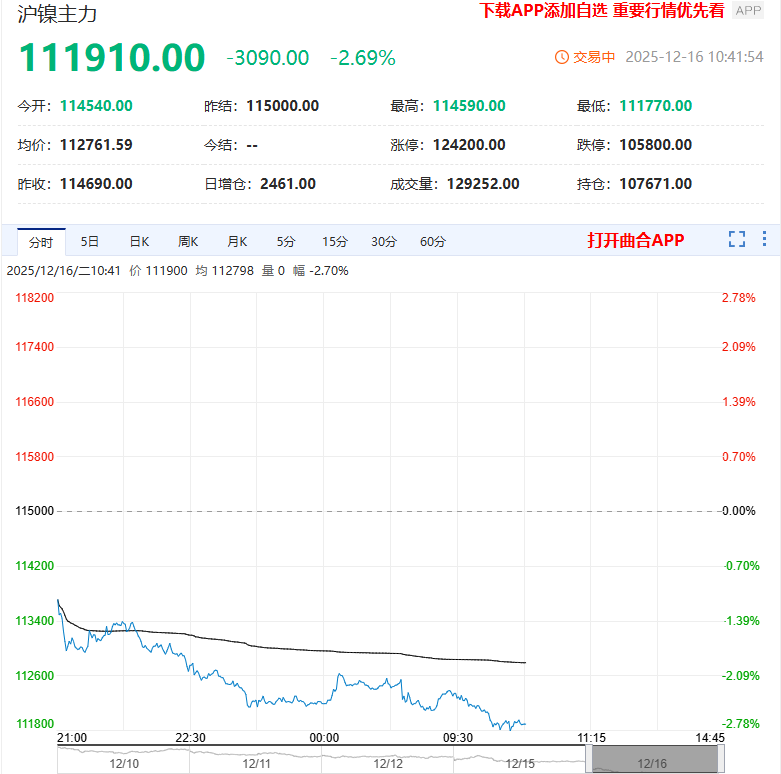 12月16日,沪镍期货价格延续下行走势,盘中创下2020年9月以来新低,且已连续四个月下跌。截至发稿,沪镍主力合约报111910.00元/吨,跌幅2.69%。