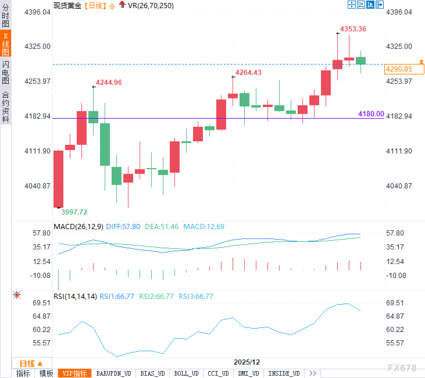 从日线结构看,现货黄金在3997.72形成阶段低点后震荡上行,先后突破并站上4180一线,趋势重心持续抬升。近期价格上破4264.43后加速冲高至4353.36,随后出现高位整理与小幅回撤,现仍处于前高突破后的回踩区间。MACD中DIFF与DEA位于零轴上方且柱体为正,显示多头动能仍占优,但柱体扩张趋缓提示短线动量可能降温。RSI约66附近,接近偏强区但未极端,配合K线高位横摆,后续更可能进入“强势震荡/消化涨幅”的阶段。结构上,4260—4290可视为短线多空分水,进一步支撑关注4180附近;上方则面临4350及更高区间的压力与波动放大风险。整体以趋势偏强、节奏偏震荡理解更为稳妥。