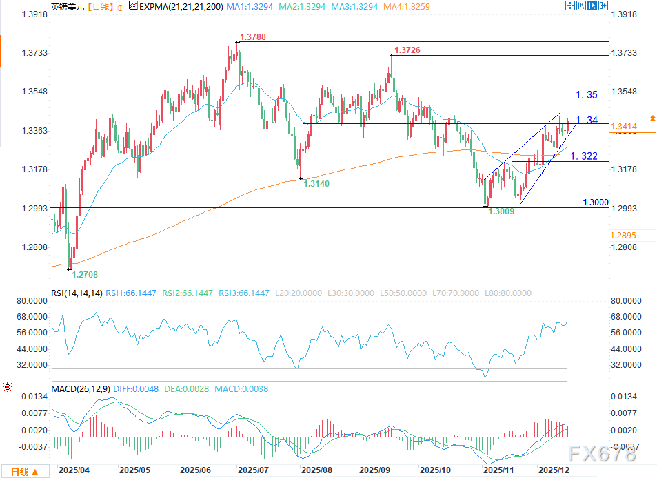 上行方面,汇价已1.3400关键关口,下一阻力指向1.3500关口。
