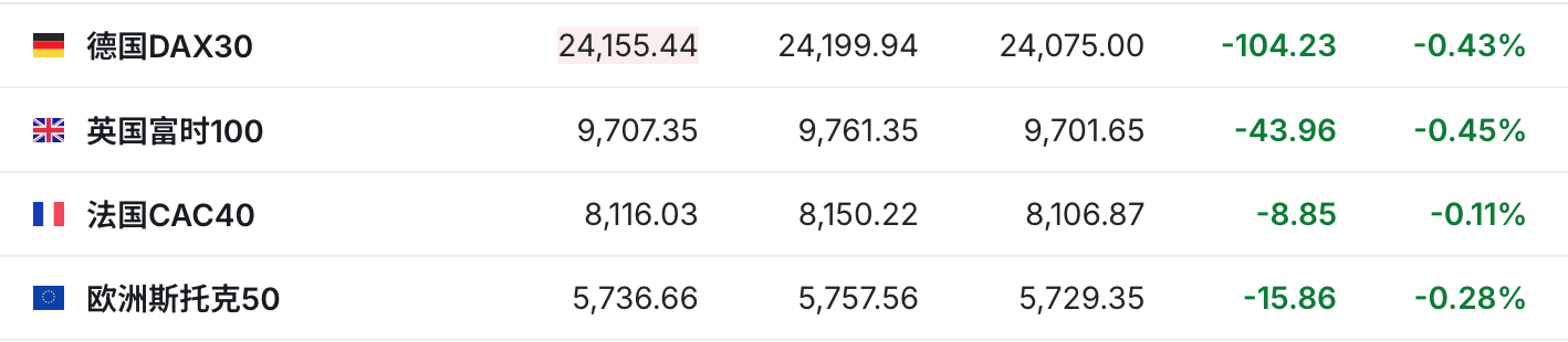 2.截至发稿,德国DAX指数跌0.43%,英国富时100指数跌0.45%,法国CAC40指数跌0.11%,欧洲斯托克50指数跌0.28%。